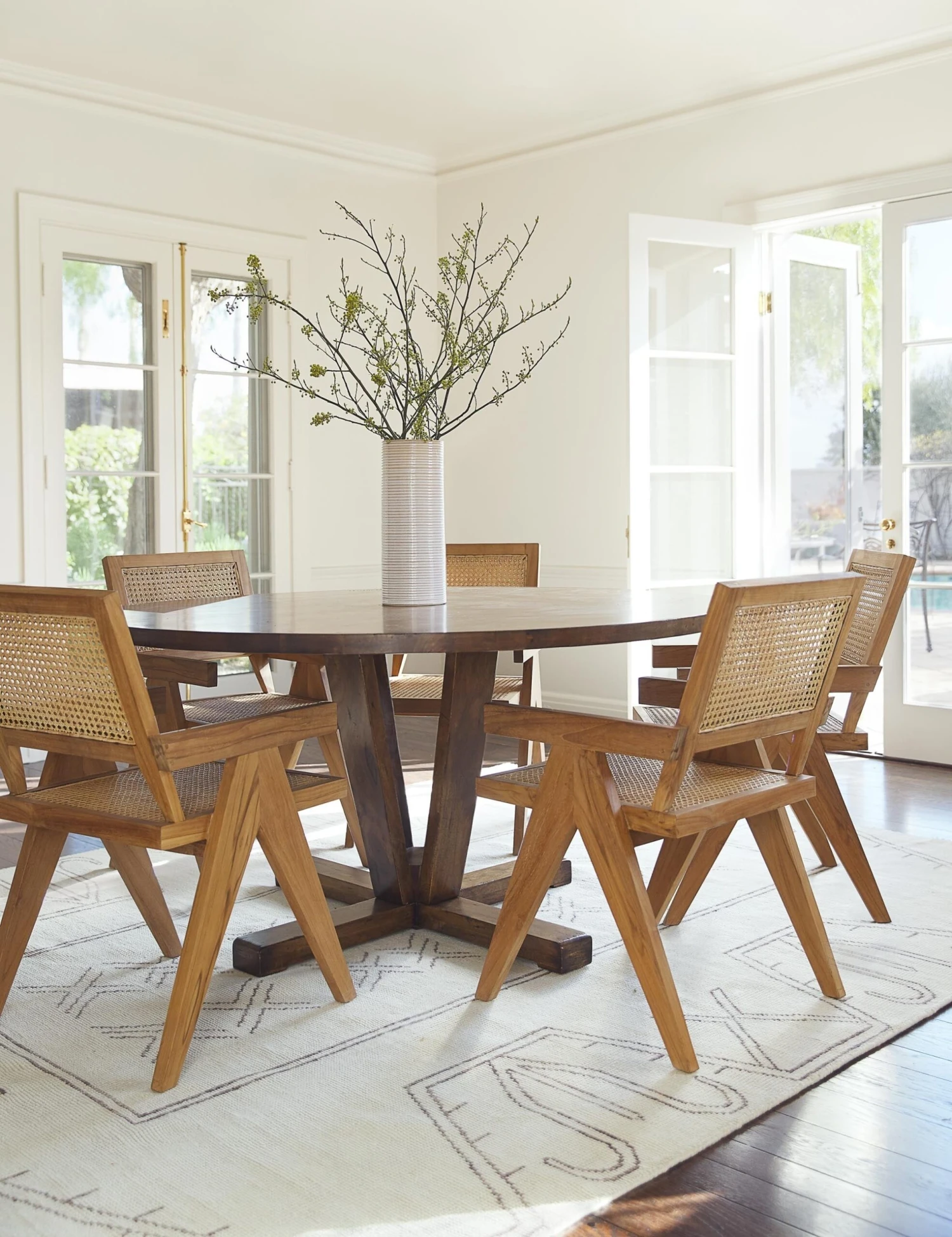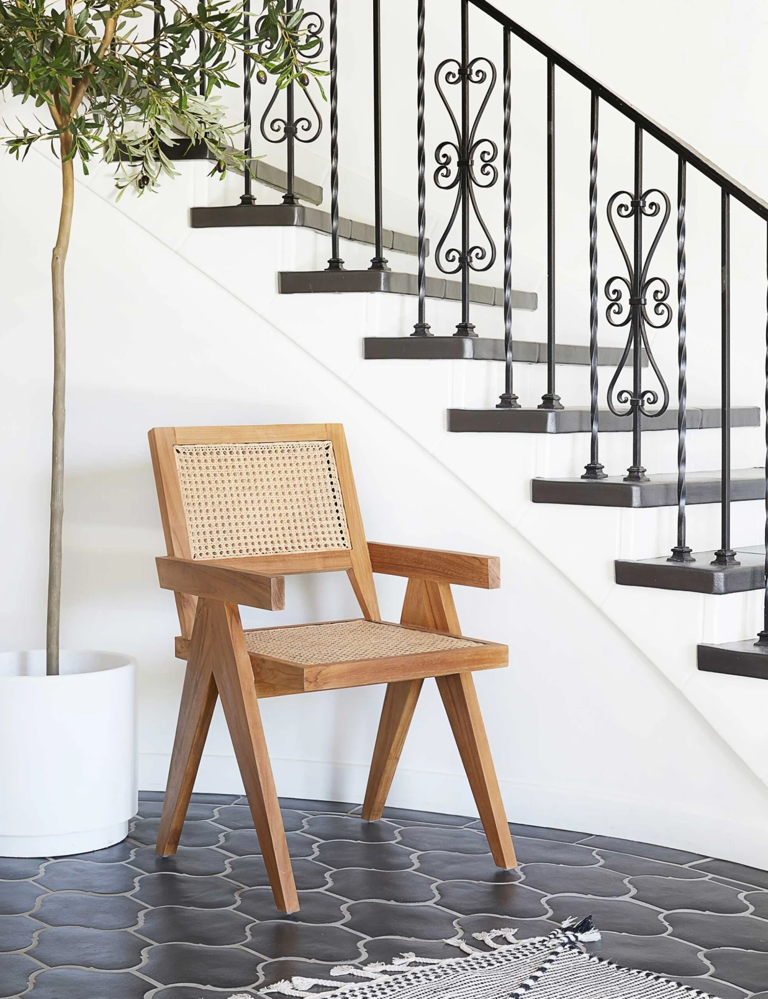 Pull a collection of these handcrafted teak and cane dining room chairs up around your table, and be prepared to settle in for a cozy evening. The angular silhouette of these dinner chairs is eye-catching, while the classic cane detailing offers comfort that blends with any home decor style.