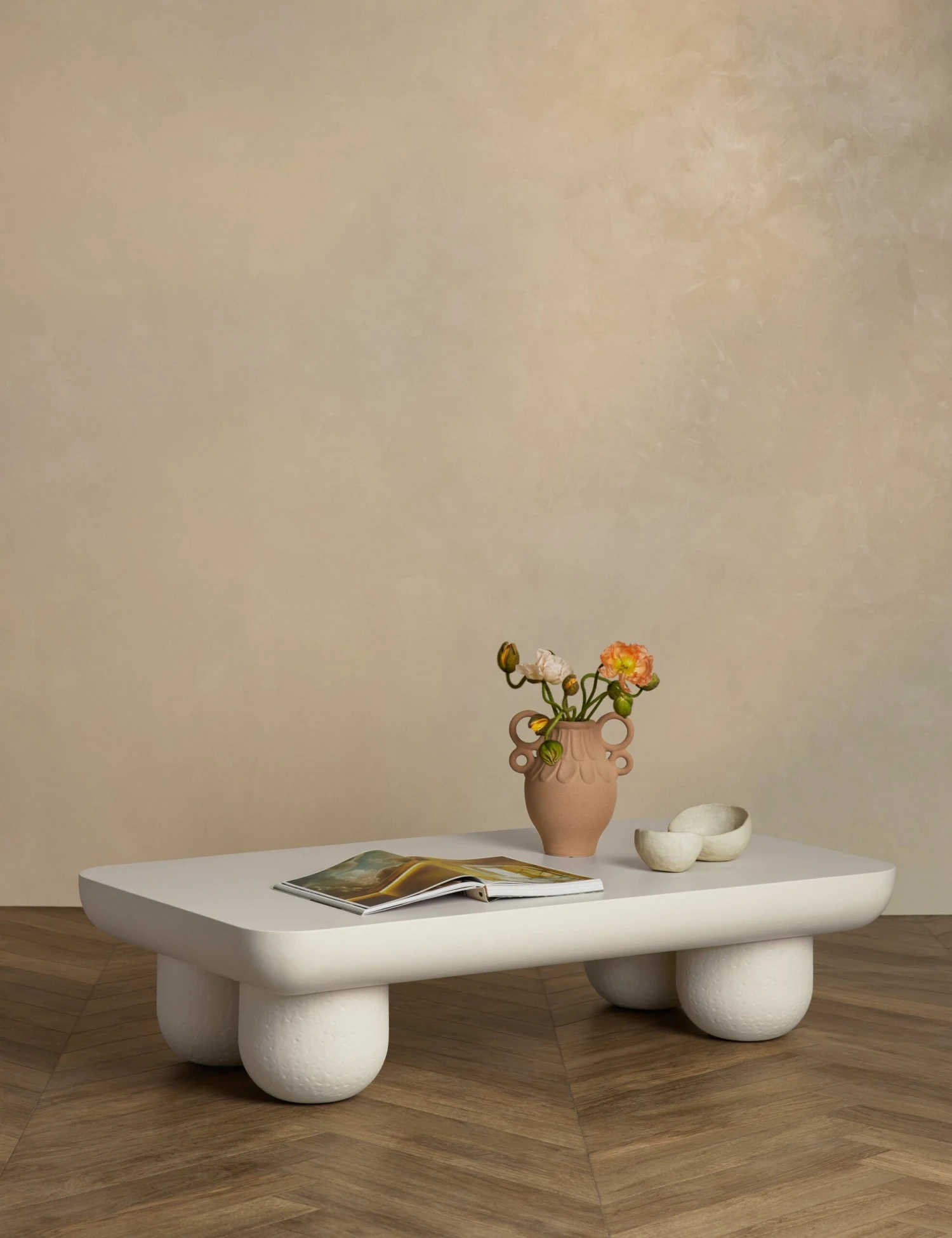 Inspired by the lightness and airy feel of clouds, this coffee table’s weighty construction provides a playful contrast to its curved form and matte white finish. The rectangular design of this concrete coffee table offers a spacious surface to anchor a living room or outdoor lounge. This piece is from our exclusive Sarah Sherman Samuel collaboration and features all the trademarks of her warm, edited style.