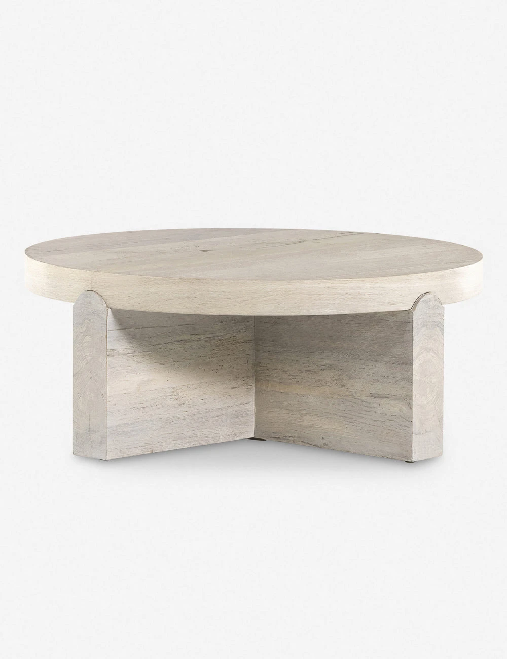 A sun-bleached oak veneer offers refined tones to the rustic splendor of this chunky wood coffee table. The round top is fashioned to fit on a cross-style base, grounding this coffee table with a sturdy, sculptural silhouette.