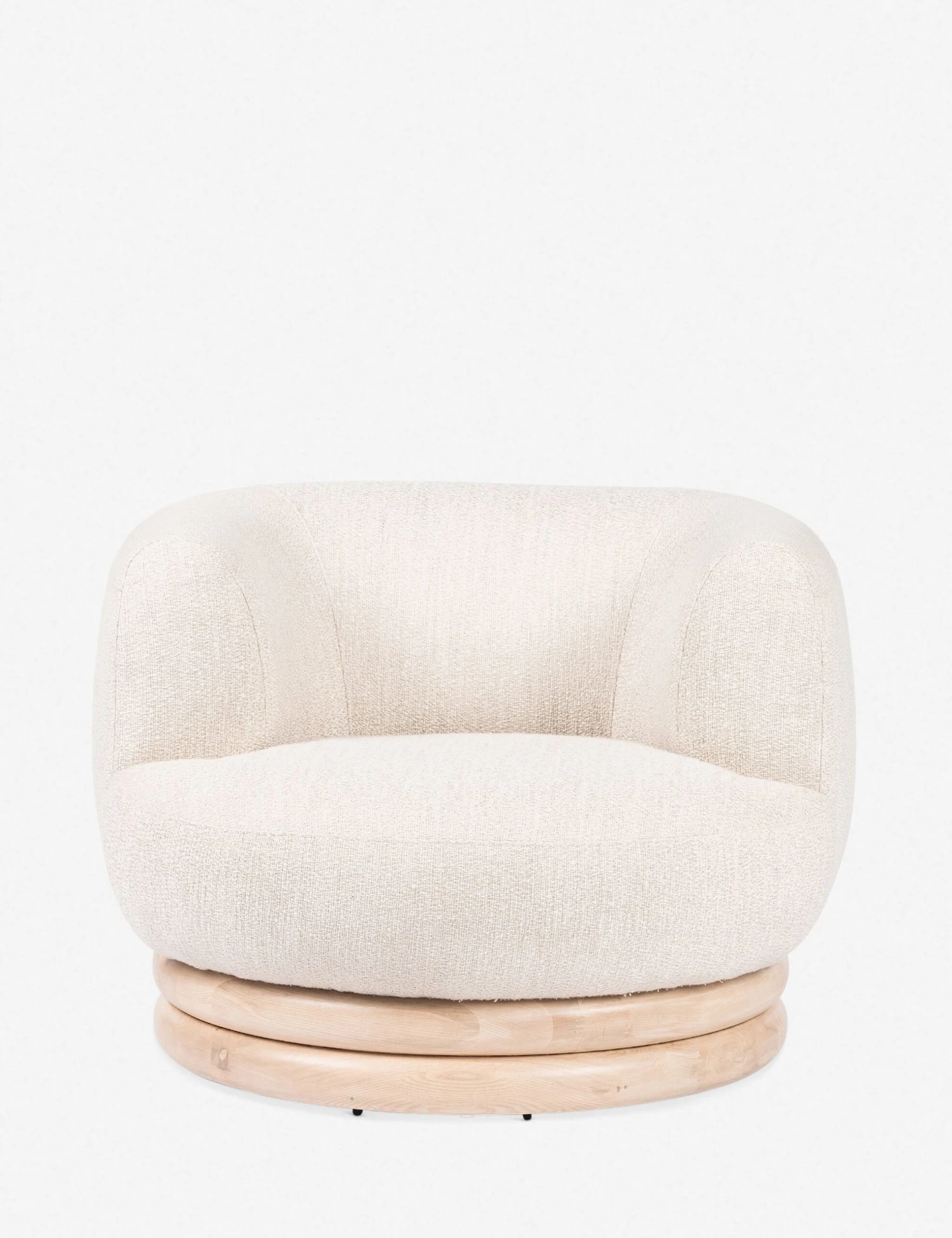 This flowing chair design pairs sculptural curves with soft performance upholstery to elevate your everyday lounge. The stacked swivel base is fashioned from solid ash wood to ground this accent chair with a subtle organic touch.