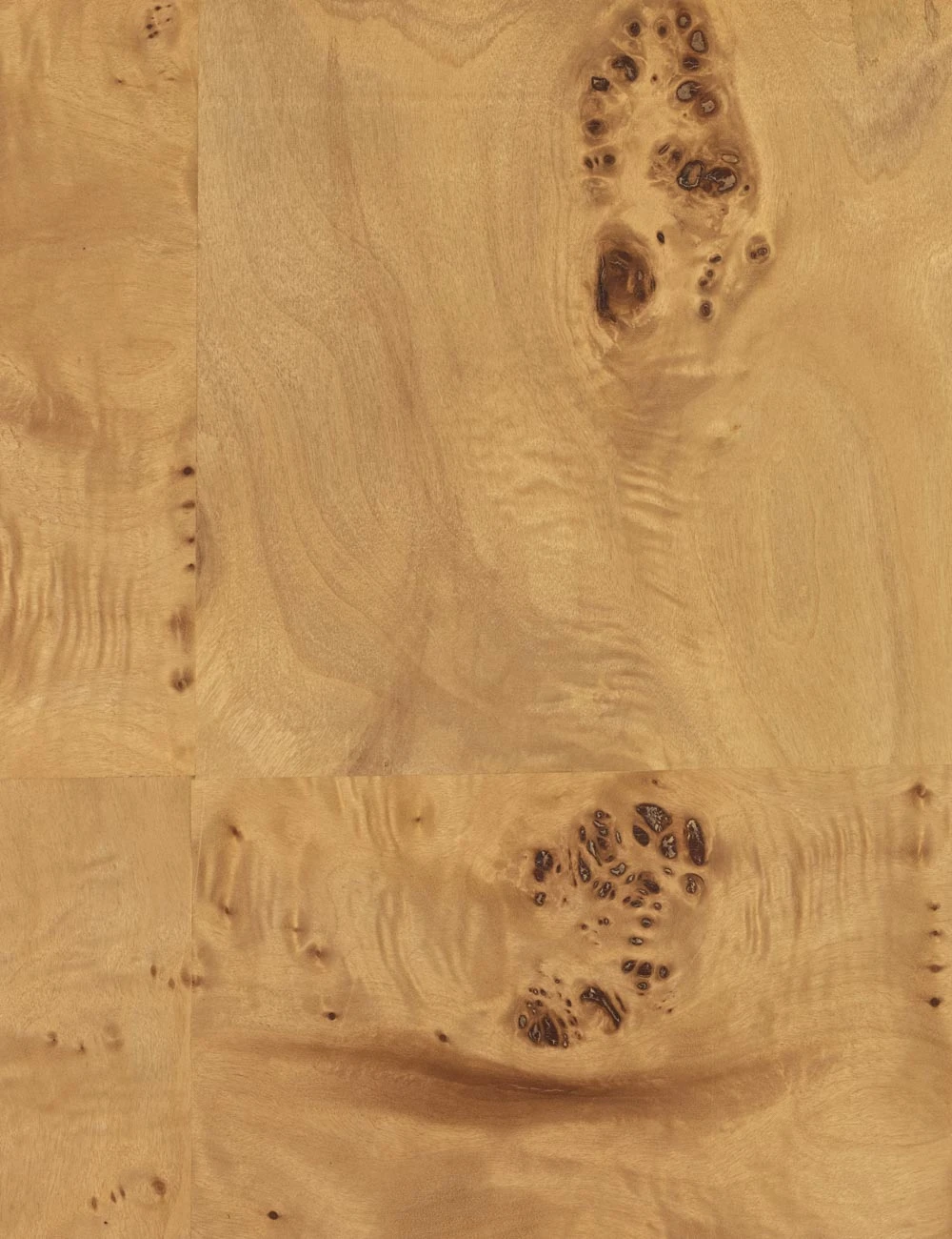 Clad in a patchwork burl wood veneer, this sleek side table offers your space a signature look. The curving waterfall design features a high polish finish highlighting its luxe natural grain. We love the seamless silhouette and warm tone this wood end table offers looks from deco to modern.