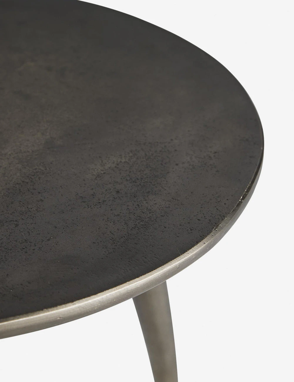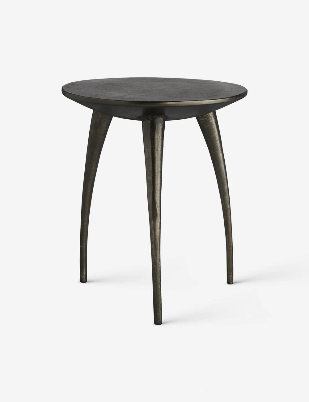 While this side table is undeniable a modern piece, there’s an eclectic charm to the look. Three tapered, bowed legs support a round top in an industrialist graphite aluminum for a sculptural effect.