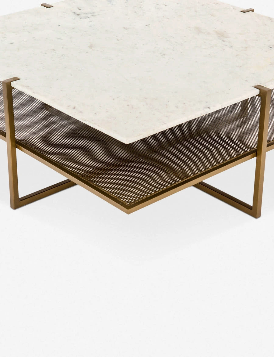 Mixing industrial elements with glamorous materials, this coffee table offers an on-trend twist on contemporary style. The antique brass frame holds a white marble slab top, and features a mesh shelf for added storage and display space.